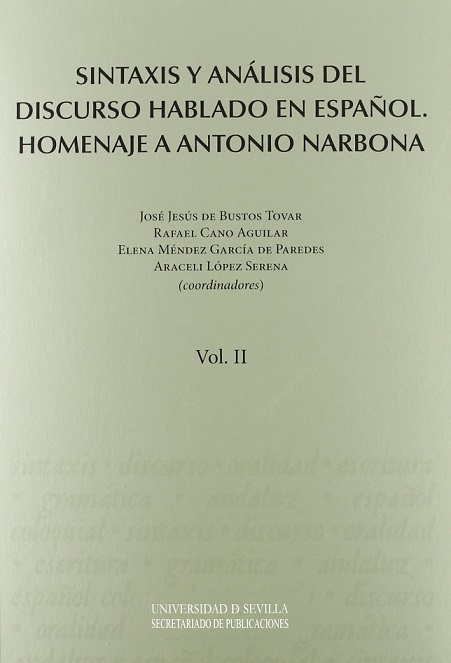 BUSTOS TOVAR, J. J., R. CANO AGUILAR, E. MÉNDEZ GARCÍA DE PAREDES y A. LÓPEZ SERENA (eds). "Sintaxis y análisis del discurso hablado en español. Homenaje a Antonio Narbona": Sevilla: Servicio de Publicaciones de la Universidad de Sevilla, 2011, págs. 1176