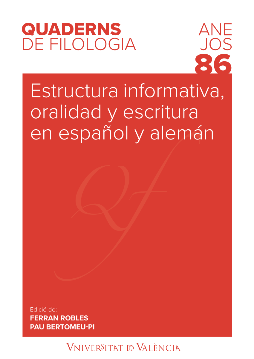 , Pau Bertomeu Pi (coord.)Este volumen tiene como objetivo el análisis de aspectos relacionados con la construcción del discurso, con especial atención a la representación de las funciones informativas del enunciado en alemán y español y los procesos de producción textual, tanto en la lengua hablada como en la escrita. El libro se estructura en tres bloques. El primero está dedicado a las funciones informativas en sí y a su expresión en alemán y español. Se exponen los mecanismos más característicos de las funciones de tópico y foco, y se presenta un estudio experimental sobre la conexión intraoracional. El segundo se centra en aspectos específicos de la oralidad. En él se reúnen dos aportaciones sobre cuestiones relacionadas con el habla real y dos más sobre su recreación en la lengua literaria (la llamada “oralidad ficcional”). El tercero aborda el estudio de la construcción del discurso en la lengua escrita. Por una parte, dos trabajos de esta sección analizan cuestiones relacionadas con el metadiscurso interpersonal y textual y su incidencia en la organización del texto en distintos géneros profesionales; por otra parte, el capítulo que cierra el volumen propone un estudio del contenido del discurso basada en el análisis de las acciones textuales que lo componen.