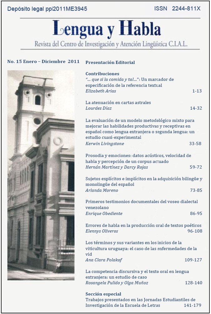 La revista Lengua y Habla es una publicación electrónica académica arbitrada del Centro de Investigación y Atención Lingüística (C.I.A.L.) de la Universidad de Los Andes. Tiene como misión divulgar entre la comunidad académica y profesional artículos de investigación y aportes de discusión de... (Ver más...)