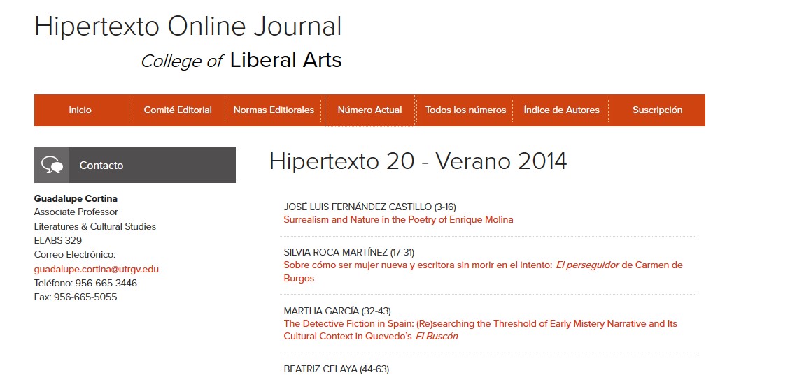 Hipertexto es una revista electrónica semestral que publica artículos y notas acerca de las lenguas, las literaturas y las culturas hispánicas, latinoamericanas y latino-estadounidenses. También da cabida a trabajos de lingüística y teoría literaria general, entrevistas, y reseñas de libros y... (Ver más...)